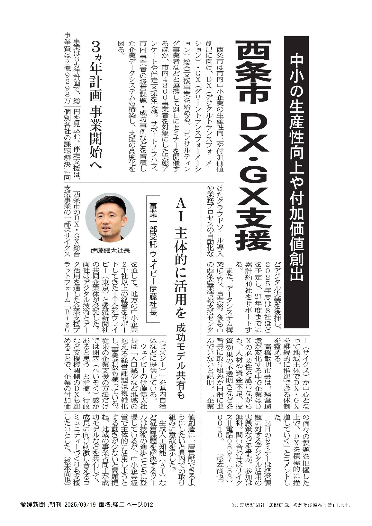 ウェイビーは、愛媛新聞社と連携し、事業者や事業支援者をサポートする経済コンテンツ配信プラットフォーム「BizG ehime」の知見を生かして、地域の生産性向上や付加価値創出を後押しします。9月24日には、経営課題に対するデジタル活用の実例を学ぶセミナーを行います。